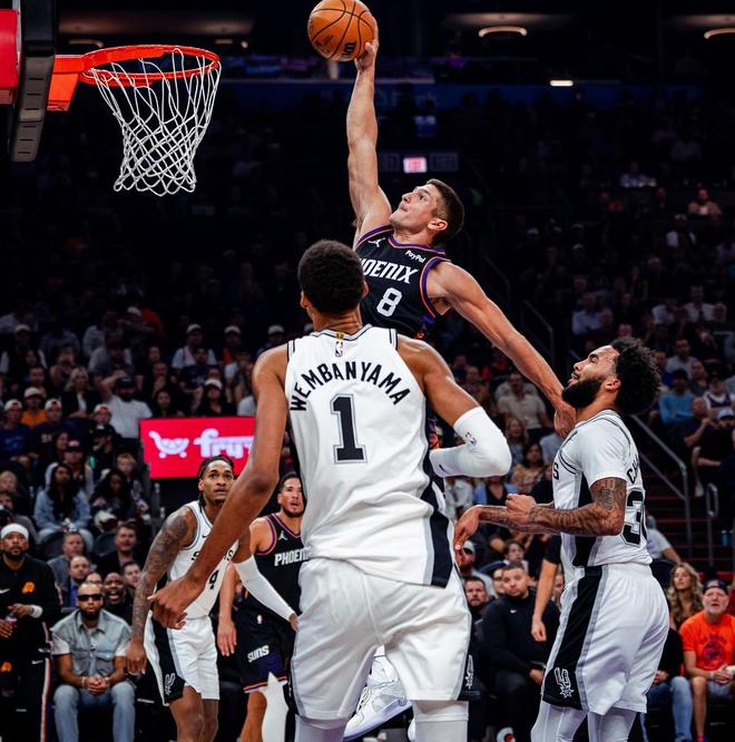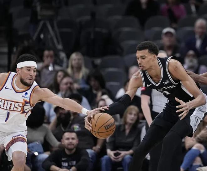 北京时间11月3日,NBA常规赛继续进行,圣安东尼奥马刺队客场挑战菲尼克斯太阳队,开赛以来马刺队取得了5胜0负的傲人战绩,要知道这可是GDP组合都无法做到的壮举,前5场比赛马刺一共6项数据联盟第一(场均丢分、快攻得分、防守篮板、防守效率、限制对手命中率,限制对手篮板),文班亚马已经彻底成长为MVP级别超级球星,在他的带领下马刺成为联盟防守第一的球队,场均仅仅丢掉103.8分遥遥领先第二的雷霆109.7分,前一场比赛面对状态不错的热火,文班亚马下半场统治攻防力克对手!反观太阳队赛季前6场比赛仅取得了2胜4负的成绩,排名西部第12名,场均得分116.3分,场均丢分121分都是联盟中下游水准,不过太阳队三分球这一项数据不错,场均出手45.7次三分球命中其中的16个(联盟第二)。上一场比赛面对爵士队,凭借布克的完美发挥,轻松取胜!
